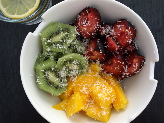 Finally finishing up my bag of plums...here is the last of them in all their glory. This is one of those simple dishes that are so easy to put together and such a feast for the eyes, as well as the palette. So pretty and delicious ! The mango w/ the coconut was by far my favorite.