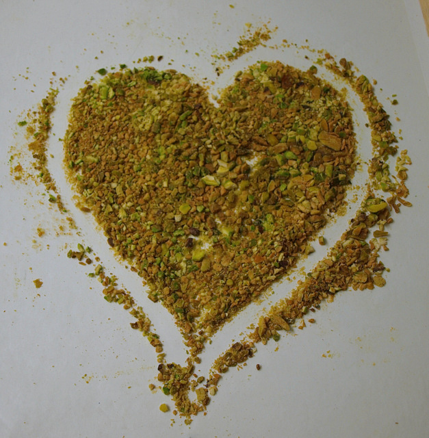 Next, the crushed pistachio pieces to roll the balls in which is optional but a nice touch. On a flat surface, I placed two peices of wax paper with about 1/4-1/3 cup pistachio's in between and used a rolling pin to smash the pistachio's, as shown above, in a somewhat rough crushing, leaving some large and mostly small pieces. Roll your balls on the nuts and store in airtight container. They will keep in the fridge for a couple weeks and last even longer in the freezer. You can always make these ahead for special occasions.