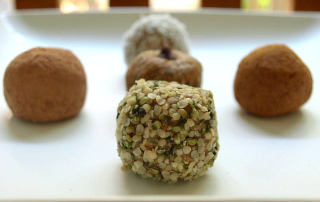 Next, roll bits of dough into one inch balls. I got 10 out of this batch, plus the little taste testing I was doing. You can roll them in a variety of ingredients. I rolled some in hemp seeds, coconut, cinnamon, raw cacao powder, and topped a few with dark cocoa chips and raisins. I wanted to experiment with different coatings. If rolling in powders be sure to gently lift and drop your coated balls a few times an inch or two above a hard surface to let any excess powder fall off. When eating, if you inhale too much powder, you may be in for a surprise....so be sure to take that step.