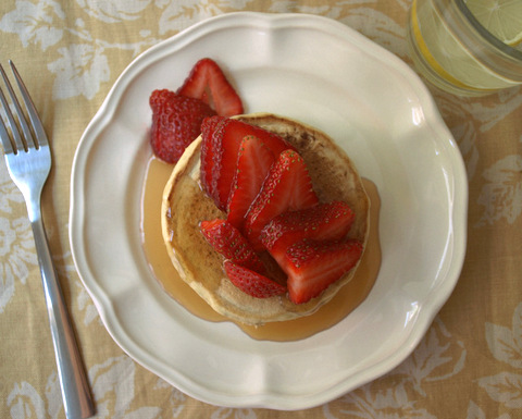 Serve with strawberries and pure maple syrup. Serves two. If you happen to have any left overs, you can store them in the fridge or freezer for later. If frozen, let thaw and pop in the toaster oven and enjoy !