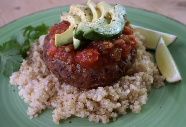 - Serve with your choice of accompaniments such as red onion slices, leafy greens, and/or salsa. Add some mashed avocado as spread, or sliced avocado if you prefer. Or serve on a quinoa like I have shown below, or bed of leafy greens. Have fun using this burger in different ways...change it up a little.
