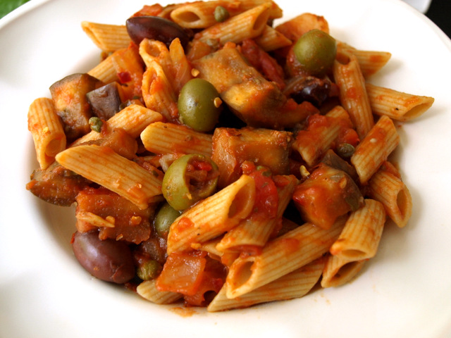 In large skillet/saute pan heat olive oil over medium high heat, cook eggplant and onion until tender, about 8- 10 min. Add sauce, olives, capers, red pepper flakes, cover and simmer for 20 min. Serve over pasta of choice (I used whole wheat) or with crusty bread.