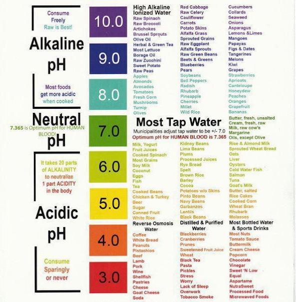 This chart is for those trying to "adjust" their body pH. The pH scale is from 0 to 14, with numbers below 7 acidic ( low on oxygen ) and numbers above 7 alkaline. An acidic body is a sickness magnet. What you eat and drink will impact where your body's pH level falls. Balance is Key !!!"